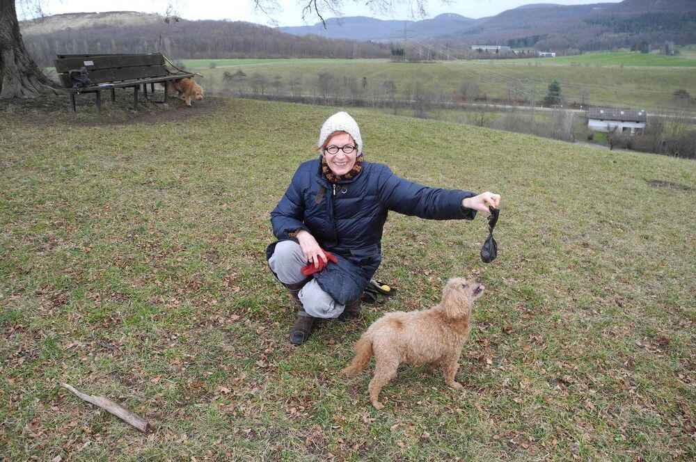 Aufsammeln – eintüten – mitnehmen: Mechthild Aisenpreis macht allen Hundebesitzern, die’s nicht wissen (wollen), vor, wie’s geht. Zwergpudel Cira findet das Ergebnis prima. GEA-FOTO: GLITZ