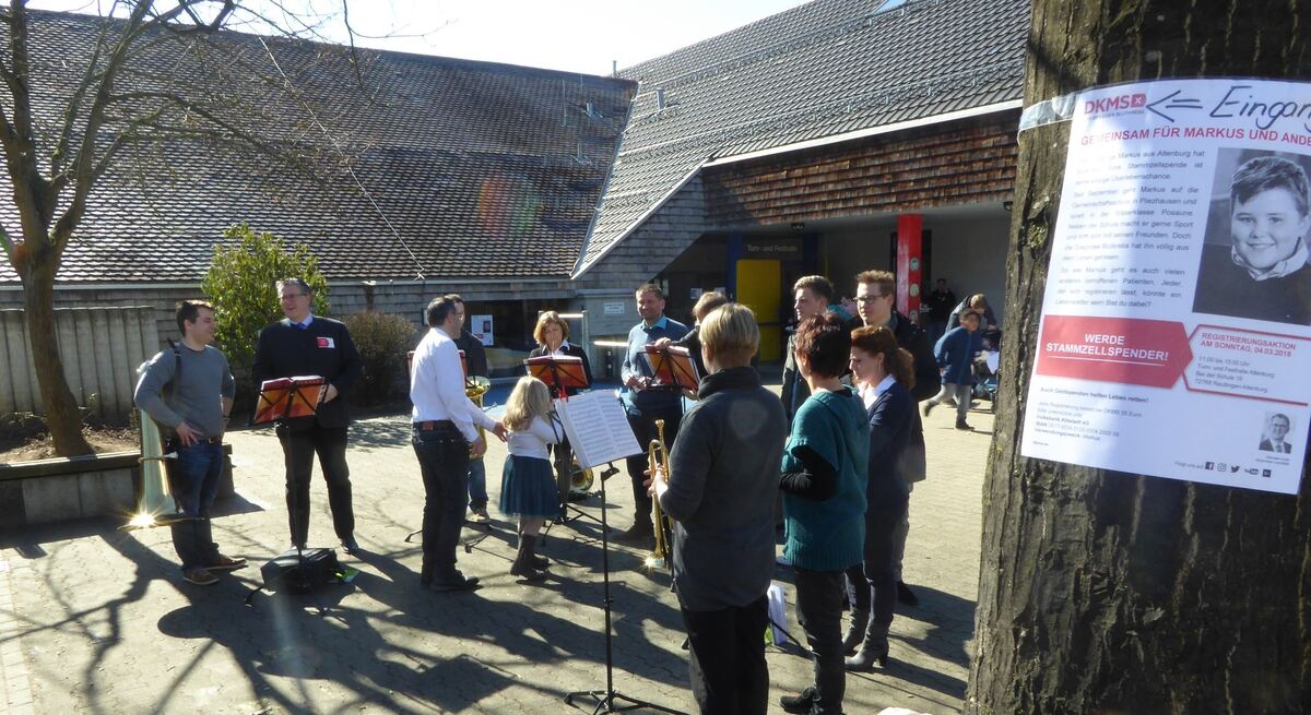 REUTLINGEN-ALTENBURG. Hunderte waren es. Gut 30 Helfer hatte Bezirksbürgermeister Frank Hofacker für die Aktion der Deutschen Knochenmarkspenderdatei DKMS organisiert. Halb Altenburg war am Sonntag über mindestens vier Mittagsstunden auf den Beinen. Der Posaunenchor der evangelischen Kirchengemeinde spielte auf dem Schulhof fetzigen Swing und Jazz. Thomas Bader eilte mit seiner siebenjährigen Tochter Bianca hinaus, um sich – mit Schirmherr Michael Donth, dem CDU-Bundestagsabgeordneten, an der Seite – bei den Musikern für ihren Einsatz zu bedanken. Der zehnjährige Bruder Tobi, nicht weniger im Glück als Vater und Schwester, tobte derweil mit zahllosen anderen Kindern kickend über den Hof.
