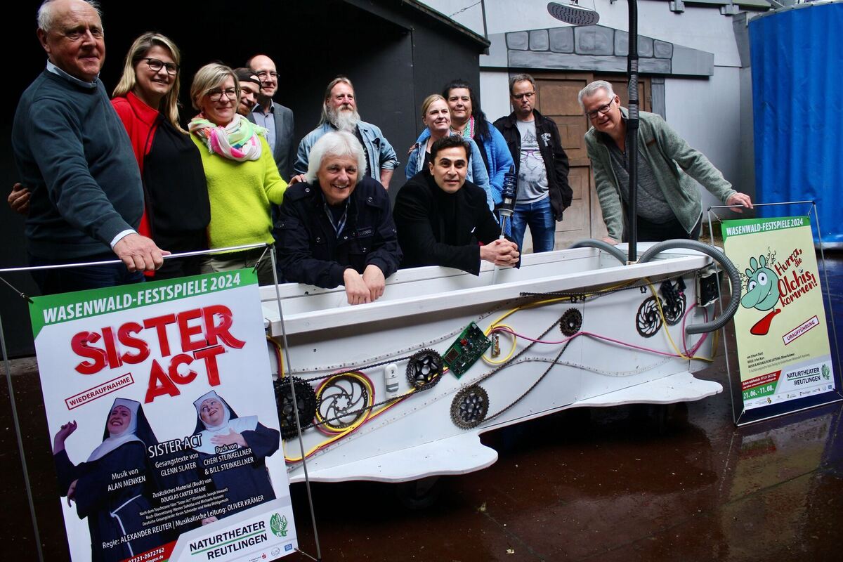 Das Naturtheater-Team hinter der Badewannen-Zeitmaschine der Olchis.