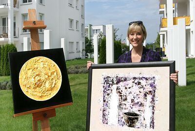 Stillleben in Acryl, eine goldene Sonne aus Seidenpapier und Farbe - und Sabine Preisendanz, die beides gemacht hat.