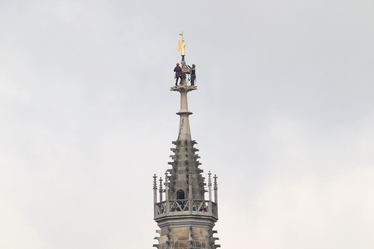 Die Marienkirche in Reutlingen mit goldenem Engel auf der Spitze.