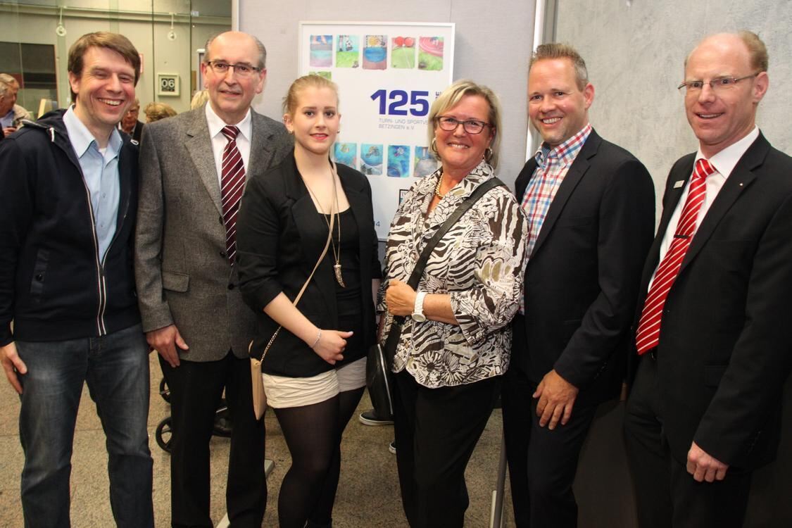 Die maßgeblichen Beteiligten freuen sich über die gelungene TSV-Ausstellung in der Betzinger Kreissparkassen-Filiale (von links): Martin Vogel, Joachim und Verena Hilsenbeck, Hanne und Tim Hummel sowie Ralf Hartich.