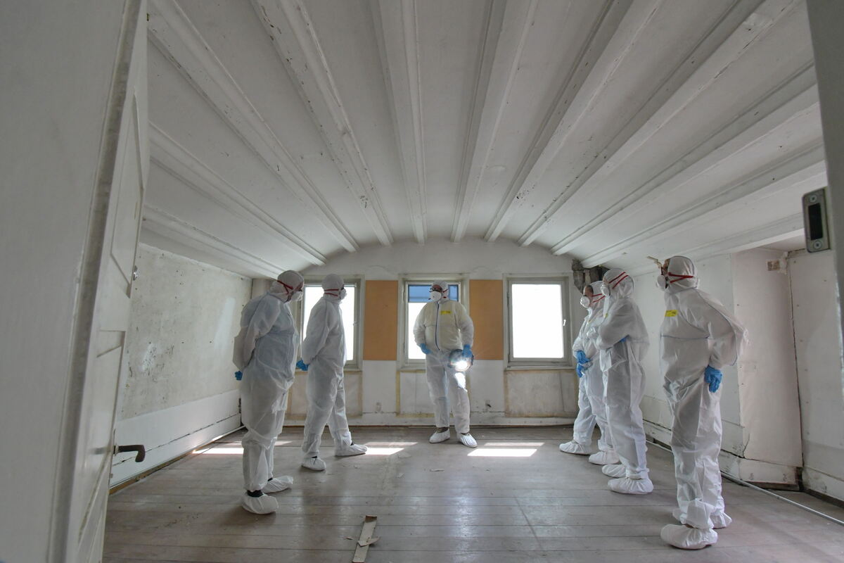 Der städtische Projektleiter Alexander Widlowski (Mitte) führt Journalisten in Schutzkleidung durch die sanierungsbedürftigen Häuser in der Oberamteistraße. Bei der zweiten Gestalt von links handelt es sich mutmaßlich um den GEA-Redakteur.