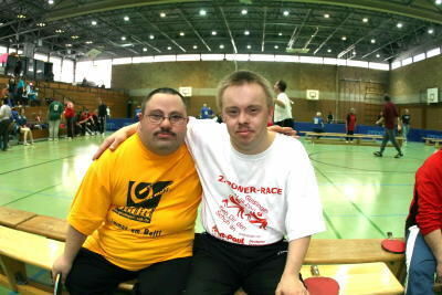 Die beiden Tischtennis-Cracks Bahatin Güncür und Bernd Nonnenmacher üben vor ihrem Match noch einmal den kameradschaftlichen Schulterschluss. Dann geht's zur Sache.