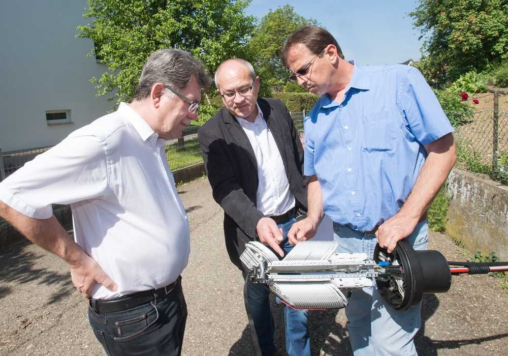 »Spatenstich« in Mittelstadt: Bezirksbürgermeister Wilhelm Haug, Telekom-Regio-Manager Winfried Hörmann und Projektleiter Jörg Schuler (von links) beäugen eine Glasfasermuffe, die demnächst ihren Beitrag zum schnellen Surfen leisten wird.