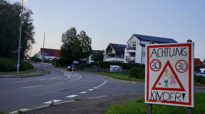 Mit Plakaten am Ortseingang fordern die Reichenecker Kinder die Autofahrer auf, den Fuß vom Gas zu nehmen.