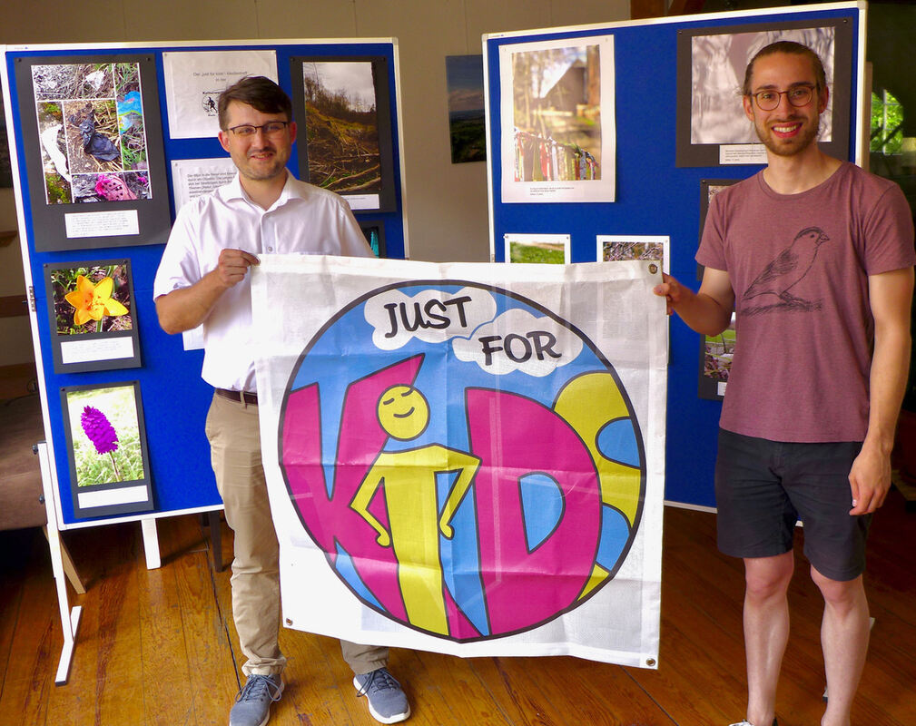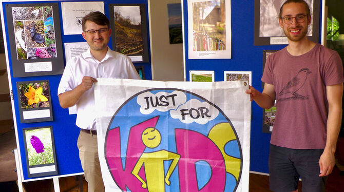 »Just for Kids«- Koordinator Florian Kern und Silas Pfeifer von der Kulturwerkstatt mit dem Logo vor der Fotoausstellung, die aus dem Online-Fotowettbewerb im ersten Jahr unter Corona-Bedingungen entstanden ist. FOTO: SIMON