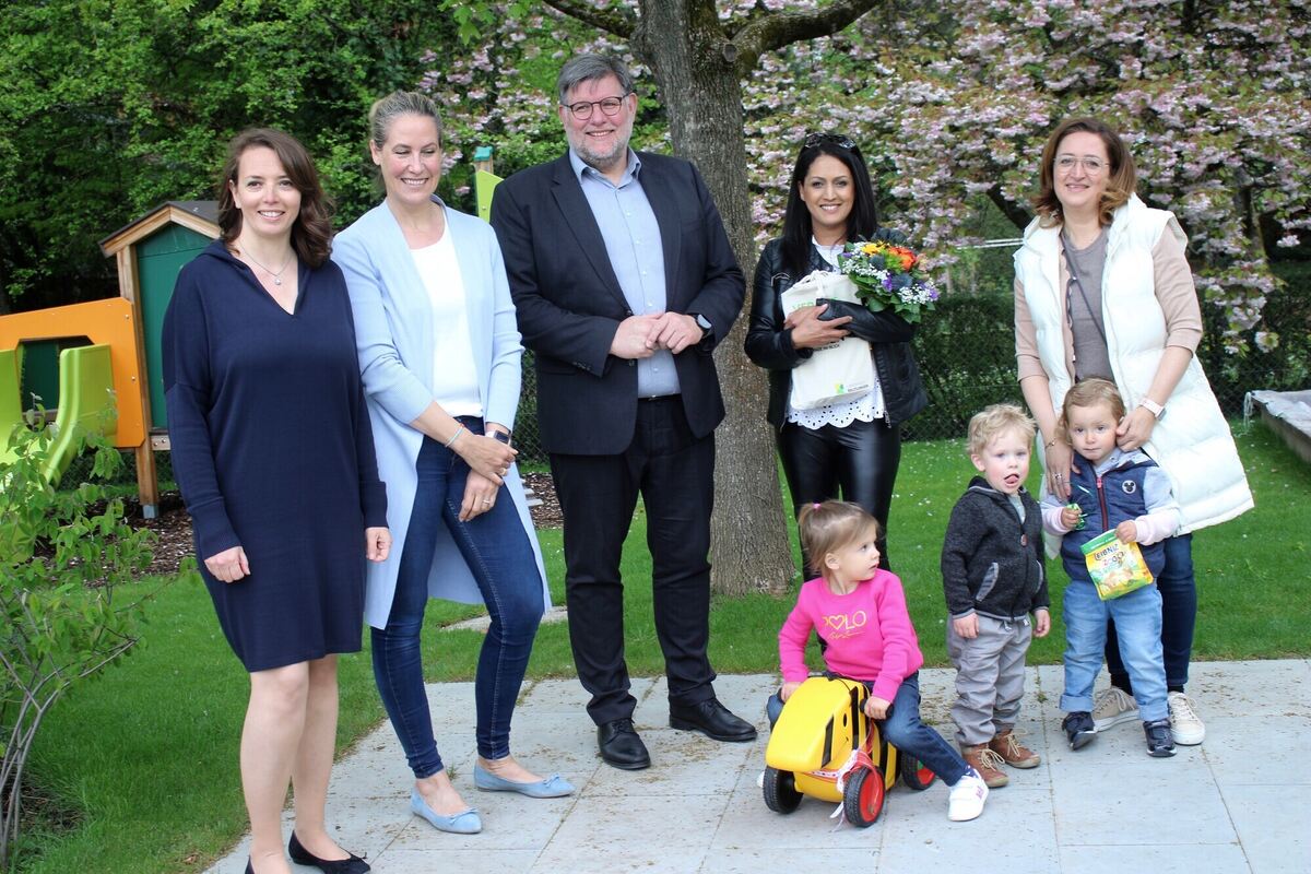 Tagesmütterverein-Geschäftsführerin Tülây Schmid, Kathrin Bahnmüller (Kreisklinik Reutlingen), Landrat Ulrich Fiedler, Tagesmutter Saadia Pusch und eine Mutter (von links) bei der Einweihung im Garten der neuen Einrichtung. FOTO: SPIESS