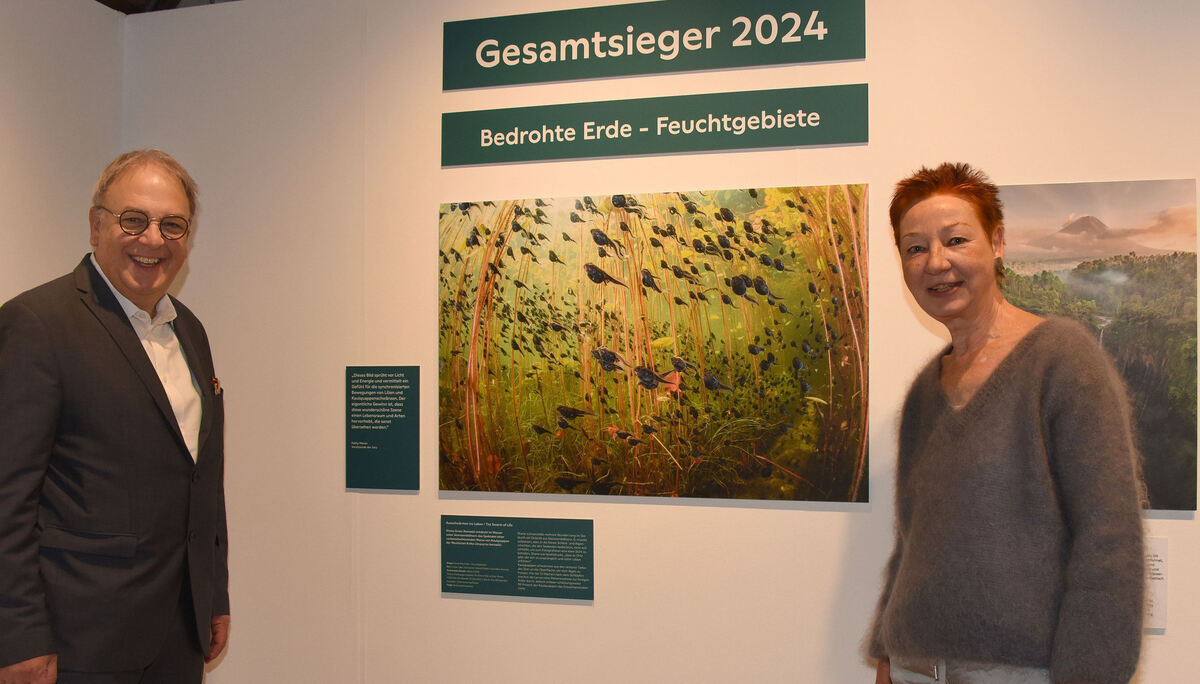 Museumsleiterin Dr. Barbara Karwatzki und Oberbürgermeister Thomas Keck vor dem Siegerfoto von Shane Gross aus Kanada, der Kaulquappen-Schwärme unter Wasser fotografierte. Die Ausstellung »Wildlife Photographer of the Year« wird jetzt im Naturkundemuseum Reutlingen gezeigt.