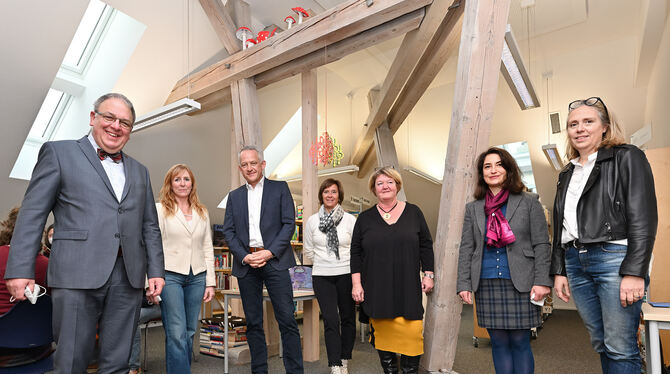 Hoher Besuch zum Bibliotheksgeburtstag: OB Thomas Keck (von links) feierte mit Edel Willjung, Schulleiter Thomas Moser, Anja Steffen-Hauser, Ute Geigis sowie Diane Grdic-Sittig und Almuth Ansorge zehn Jahre »Bibliothek im Dach« des Keplergymnasiums. FOTO: PIETH
