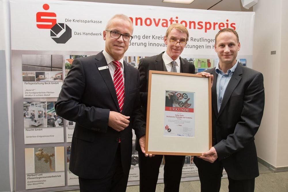 Kreissparkassen-Vorstandsvorsitzender Michael Bläsius und Handwerkskammerpräsident Harald Herrmann überreichen die Siegerurkunde im Innovationspreis 2015 an Stefan Dachs, Reutlingen (von links).