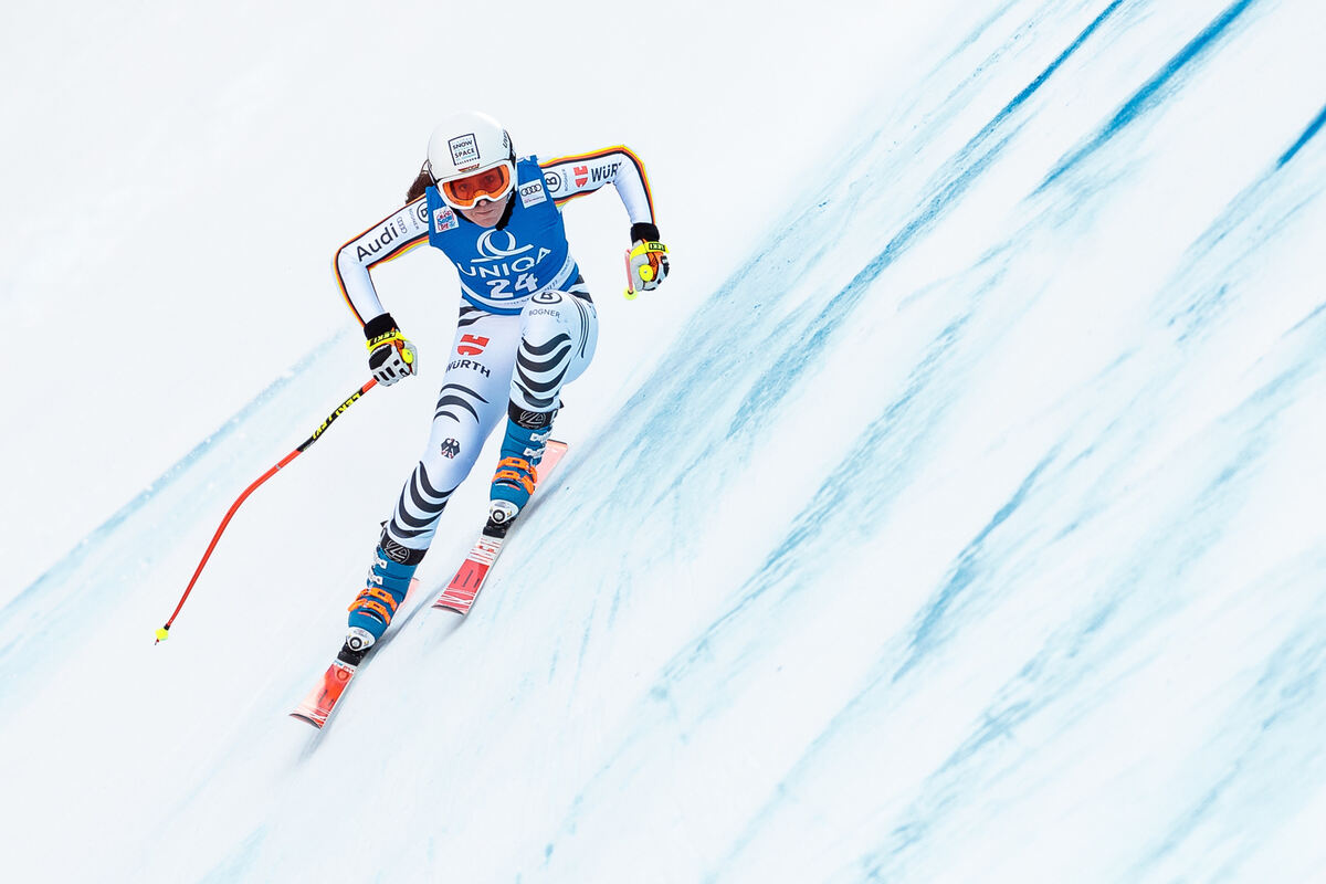 Die deutsche Skirennläuferin Kira Weidle (links im Rennanzug) trägt vor dem Start die in Reutlingen entwickelte Überhose. FOTOS: DPA, PR