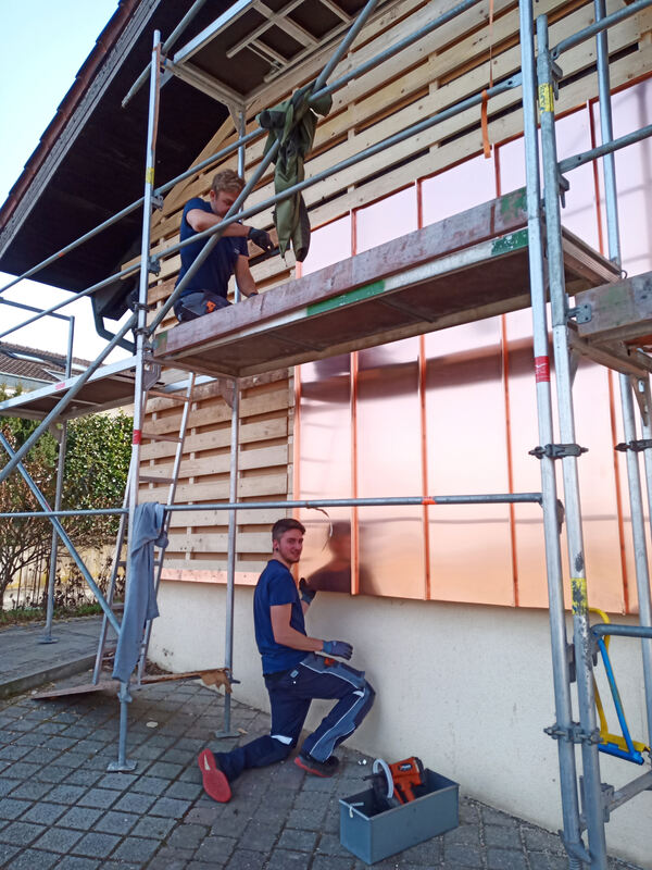 Bei der Stefan Künstle GmbH werden anspruchsvolle Projekte auch immer in die Ausbildung integriert, sodass der Lehrling oder der Meisterschüler von Anfang an bei größeren fachlich anspruchsvollen Projekten involviert ist und so unglaublich viel lernen kann. So war Alexander Künstle selbst mit dem Projektteam Fassade unterwegs, um eine anspruchsvolle, 90 Quadratmeter große Kupferfassade in Altenburg zu installieren.