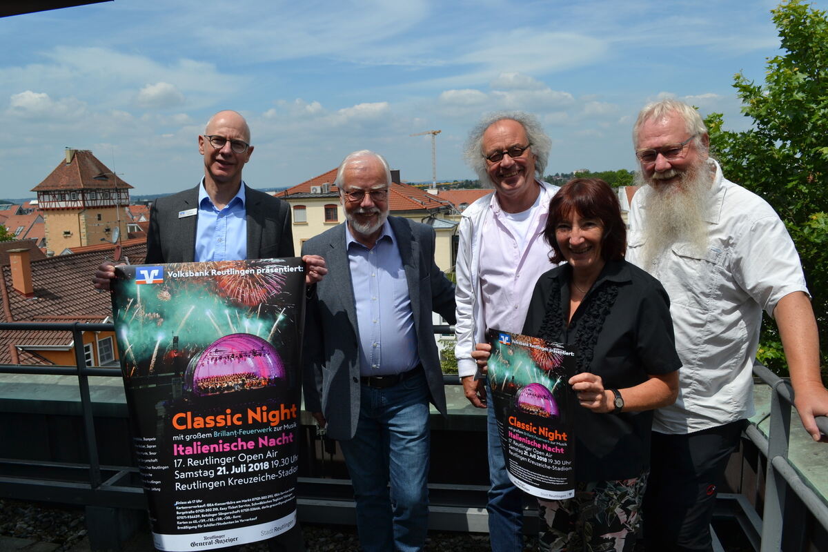Ziehen für die Classic Night an einem Strang (von links): Siegfried Arnold (Volksbank Reutlingen), Dr. Peter Beckmann (Vorsitzender Betzinger Sängerschaft), Martin Künstner (Musikalischer Leiter), Monique Cantré (Vorsitzende Philharmoniachor Reutlingen) und Reinhard Feiler (Technischer Leiter).
