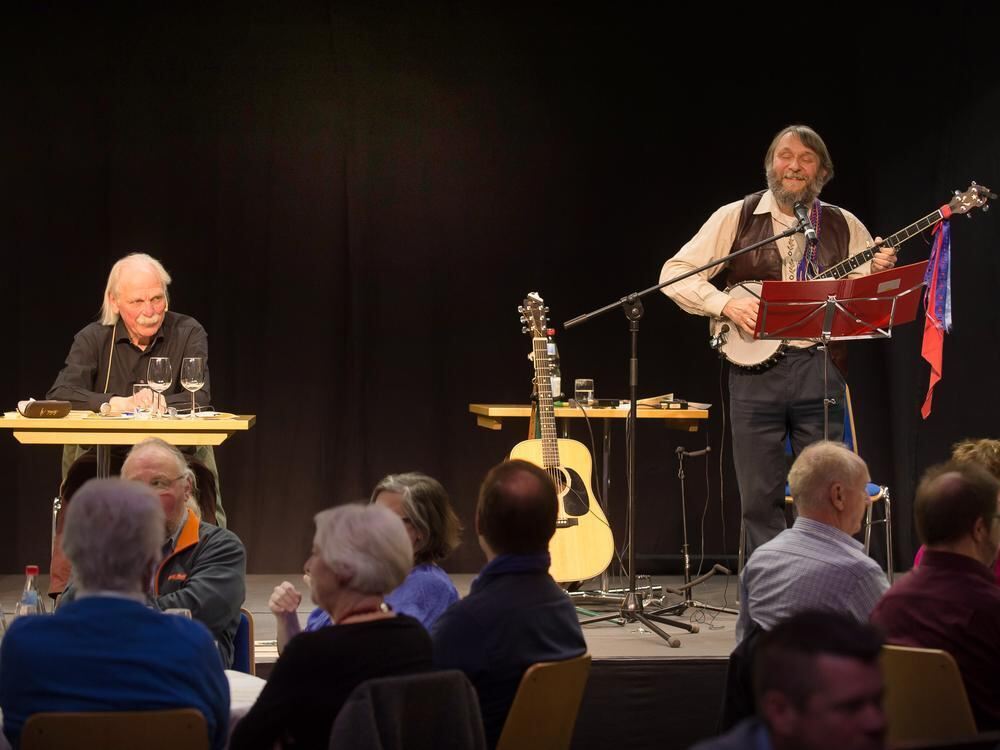 »Wein & Wort« in der Volksbank. Im Bild Mundartwochenmacher Wilhelm König (links) und der Liedermacher Michael Skuppin.