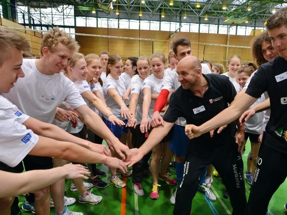 Die Abiturienten werden von TVR-Trainer Hans-Peter Müller-Angstenberger (schwarzes Polo-Shirt) eingeschworen.