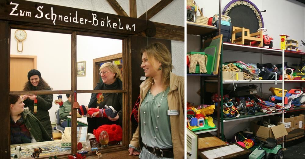 Teamtrainerin Beatrix Krause (rechts) hatte die Idee des »Schneider-Bökel-Hauses«. Drin werden in der Toys Company Puppensachen gehäkelt und gestrickt sowie Puzzles auf Vollständigkeit geprüft.