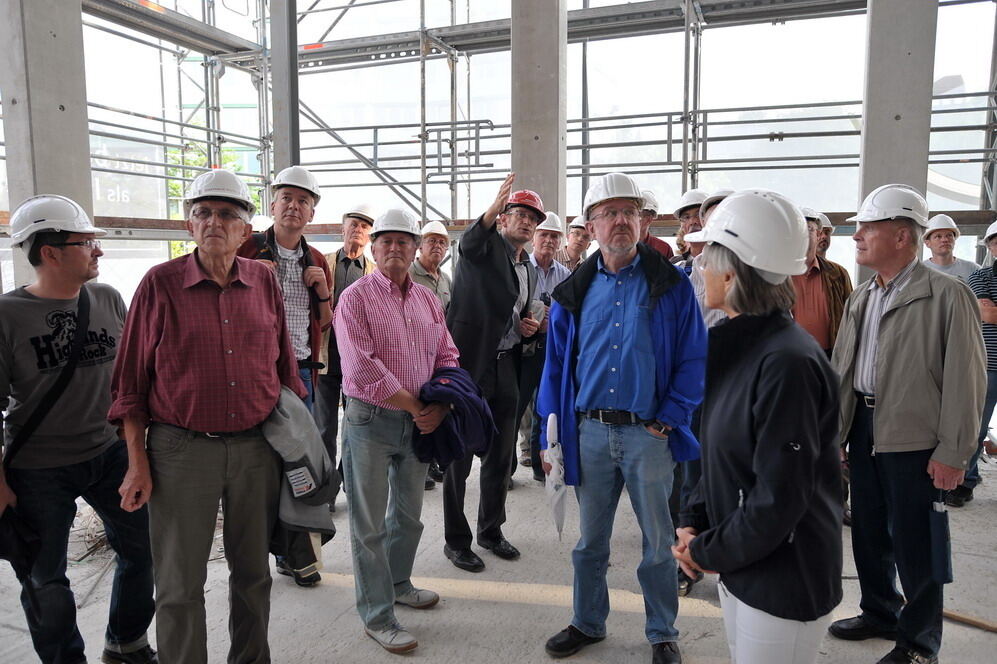 Projektleiter Klaus Kessler (mit rotem Bauhelm) zeigt GEA-Lesern die Stadthallen-Baustelle. FOTO: Niethammer