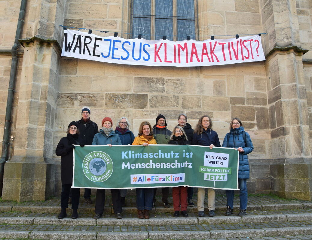 Weithin sichtbar und öffentlichkeitswirksam hängt das große Banner an der zentralen Tübinger Stiftskirche.