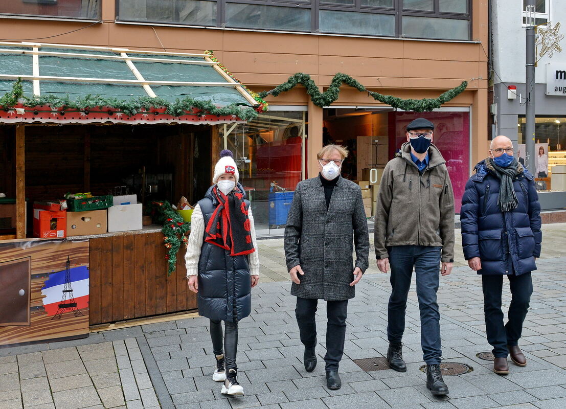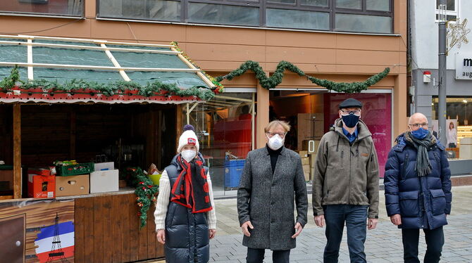 Sie haben den Regionalmarkt in der Wilhelmstraße 94 (im Hintergrund) und die weihnachtlichen Stände in der Innenstadt kurzfristig möglich gemacht: (von links) Anja Sommer vom Café Sommer, Norbert Brendle von der Markt-Werk-Stadt, Albert Keppler vom Ordnungsamt und Jürgen Mettendorfer vom Amt für Wirtschaft.