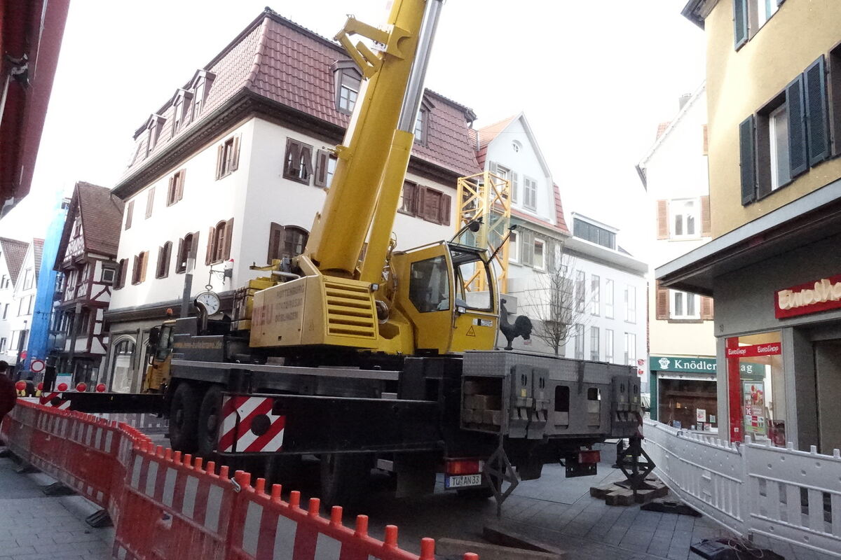 Es wird eng, wenn der Baukran in der Katharinenstraße steht. Auf dem kleinen Foto ist ein Fuß des Fundamtkreuzes zu sehen. FOTOS: DÖRR