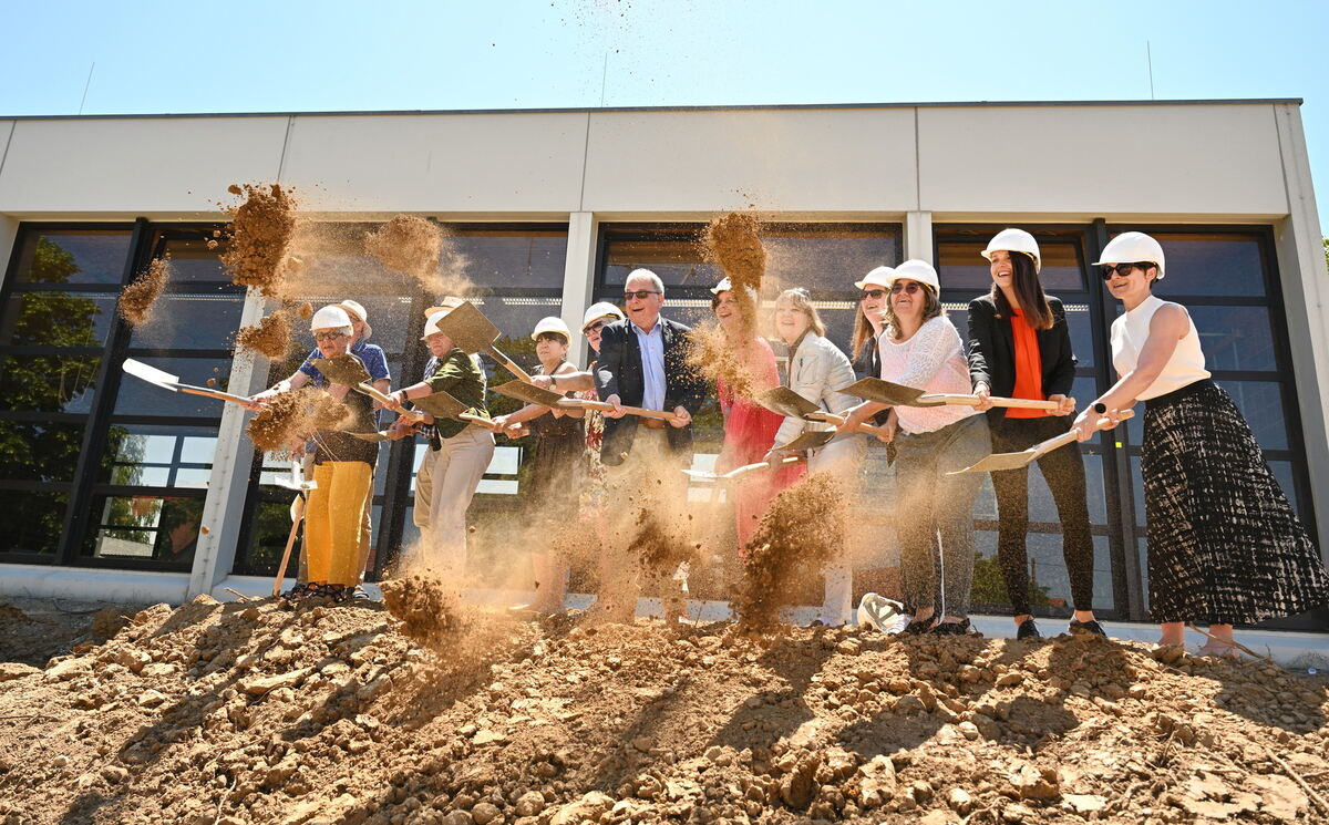 Vertreter aus der Kommunalpolitik und von der Rommelsbacher Grundschule wirbeln beim Spatenstich für den Erweiterungsbau am Reisweg mächtig viel Staub auf. FOTO: PIETH