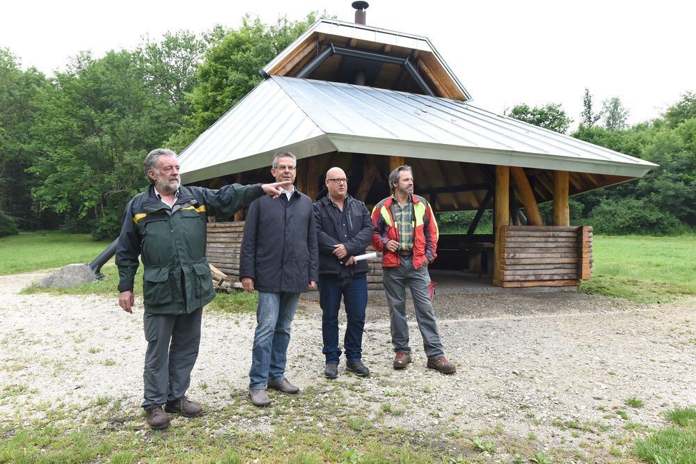 Präsentierten die »neue alte« Grillhütte auf der Jungviehweide (von links): Revierförster Johannes Schempp, Berthold Negwer und Stefano Cenni vom Amt für Immobilien und Wirtschaft sowie Peter Hohloch vom Forsthof.