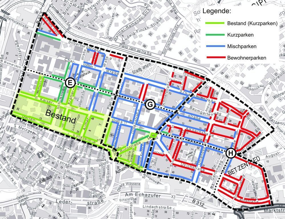 Bis Ende des Jahres soll die Oststadt zwecks Parkraumbewirtschaftung in drei Zonen (E, G, H) unterteilt werden. In jeder dieser Zonen sollen unterschiedliche Stellflächen ausgewiesen werden: Solche, die Anwohnern mit Parkausweis vorbehalten sind (rot), solche, die Anwohnern und Besuchern zu Verfügung stehen (blau), und solche, die nur Kurzzeitparken vorsehen (grün). Letztere sind umstritten, weil hier Anwohnerausweise keine Gültigkeit haben. GRAFIK: STADT