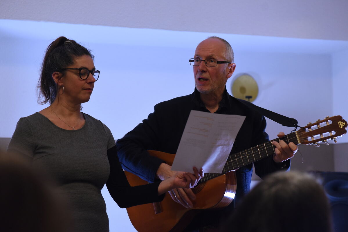 Die Initiatorin Nicole Krieg und der Hauptgast des ersten Reutlinger Mundartabends, Liedermacher Roman Mangold, singen zum Schluss gemeinsam ein Lied.