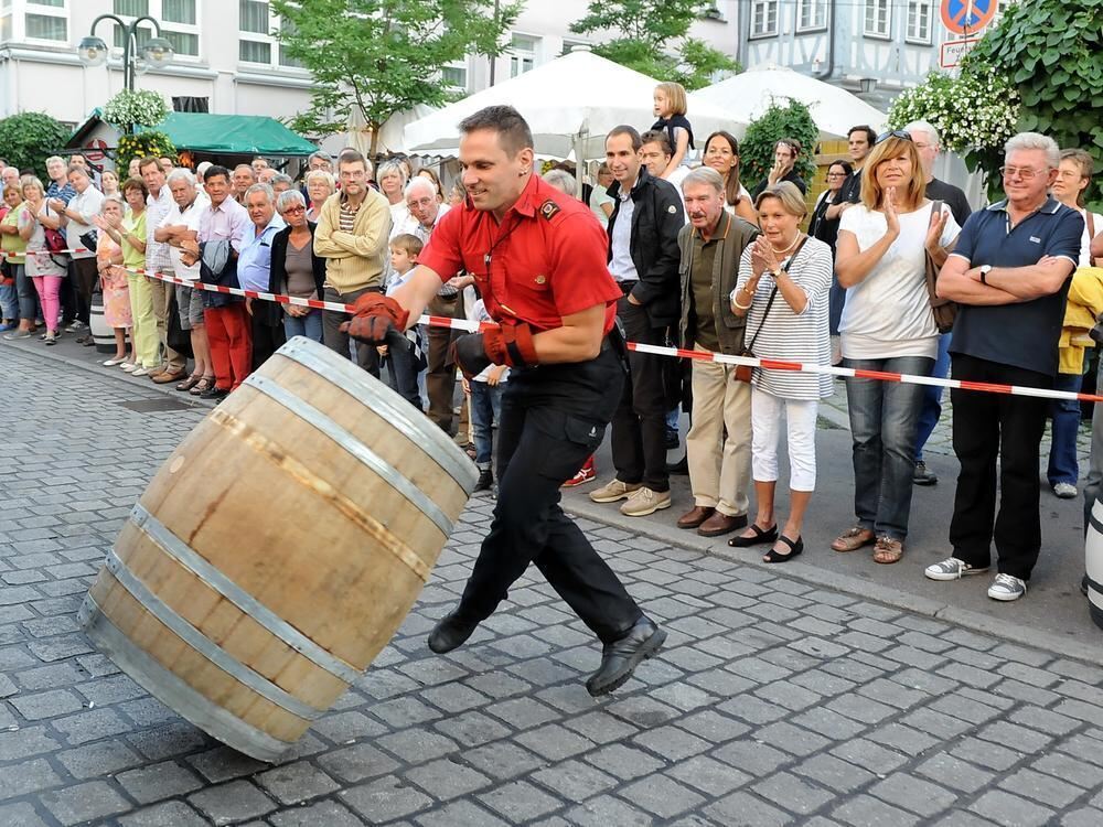 Einer der schnellsten, der Aarauer Feuerwehrmann Dave Selinger, der beim Fassrollen knapp geschlagen den zweiten Plattz belegte.