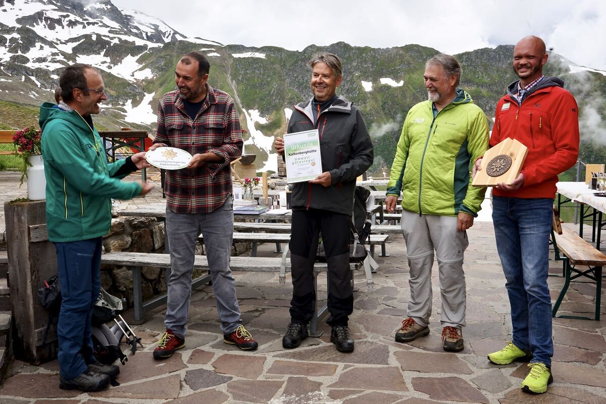 Geschäftsbereichsleiter Hanspeter Mair (links) und DAV-Vizepräsident Roland Stierle (Vierter von links) überreichen das Umweltgütesiegel an Wirt Markus Kegele und die beiden Reutlinger DAV’ler Berthold Negwer (Mitte) und Jochen Ammann (rechts).