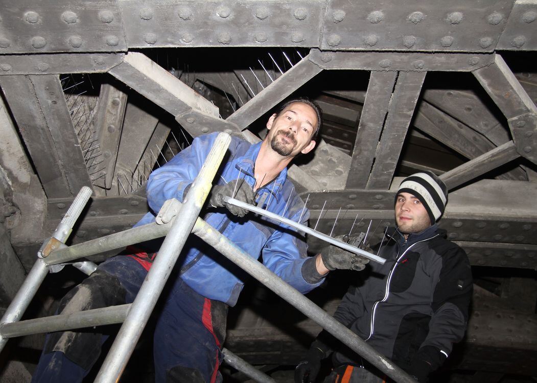 An der Eisenbahnbrücke »Unter den Linden« werden derzeit Taubenabwehrspitzen aus Edelstahl montiert. Sie gelten als rostfrei und lange witterungsbeständig. FOTO: KOZJEK