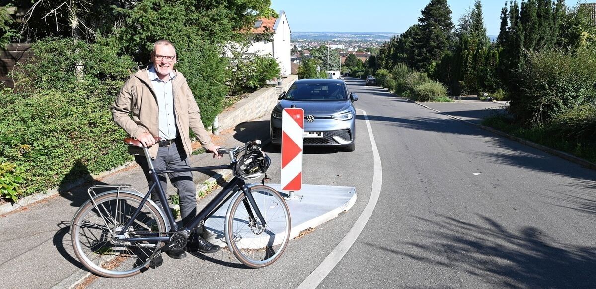 Der Reutlinger Ordnungsamtsleiter Albert Keppler an einer der Fahrbahnverengungen auf dem Königsträßle mit denen Raser zur Räson gebracht werden sollen. Manche Vollgaspiloten nutzen die Dinger zum Slalomfahren – bis es kracht.