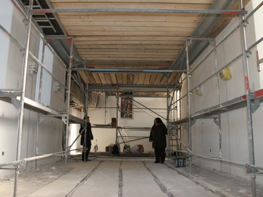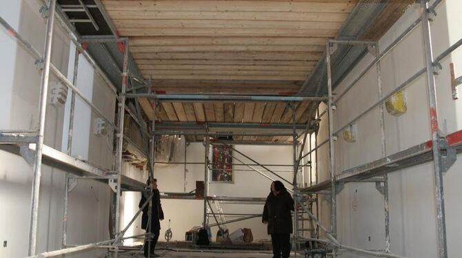 Gudrun Topp und Pfarrerin Karin Berghaus - im Hintergrund der Fensterrahmen für das Buntglasfenster mit dem heiligen Nikolaus. Und auch wenn es noch nicht so aussieht: Bei den Renovierungsarbeiten ist Land in Sicht.