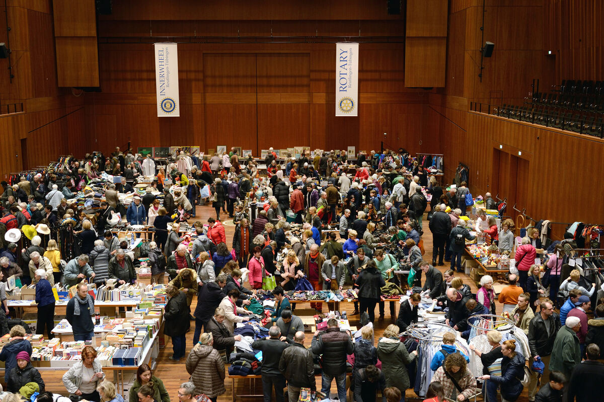 Wimmelbild aus der Vogelperspektive: Der Secondhandbasar von Inner Wheel und Rotary ist auch im 19. Jahr seines Bestehens ein Event, das die Massen anzieht – und zwar buchstäblich. Damen-, Herren- und Kindermoden machen’s möglich. FOTOS: PIETH