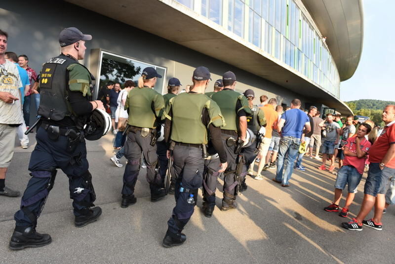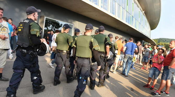 Ein Großaufgebot von Polizisten sicherte das DFB-Pokalspiel im Kreuzeichestadion. Foto: Uschi Pacher