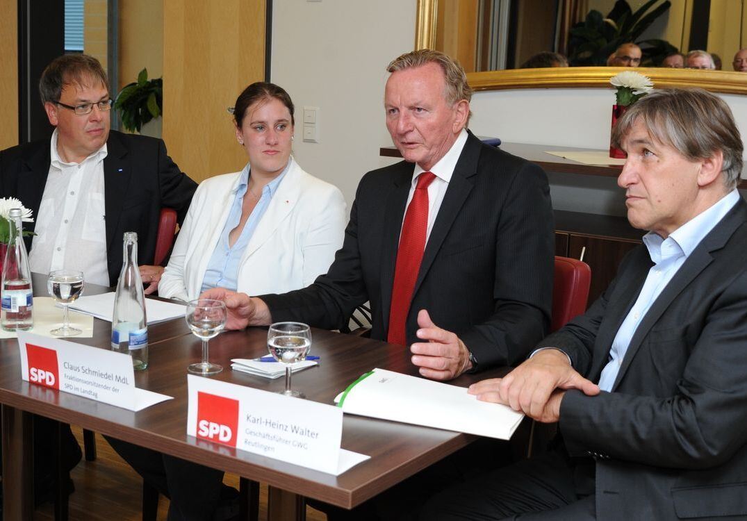 Gut besetztes Podium um Rebecca Hummel: Herbert Mang (von links), Thomas Keck, Claus Schmiedel und Karl Heiz-Walter hatten vielfältige Meinungen und Ansätze zum komplexen Thema Wohnungsnot. GEA-FOTO: PACHER