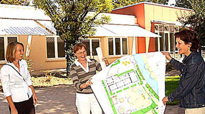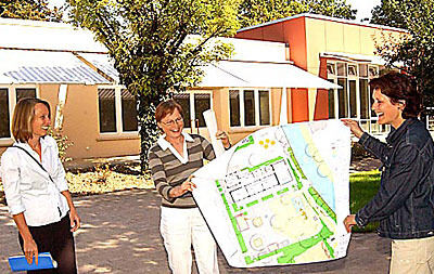 Zufrieden mit der rundumerneuerten Kindergarten-Oma (von links): Kariane Höhn (Sozialamt/Kinderbetreuung), Monika Stadthaus (Hochbauamt) und Ursula Ruck (Amt für Bauverwaltung, Grünflächen und Umwelt).