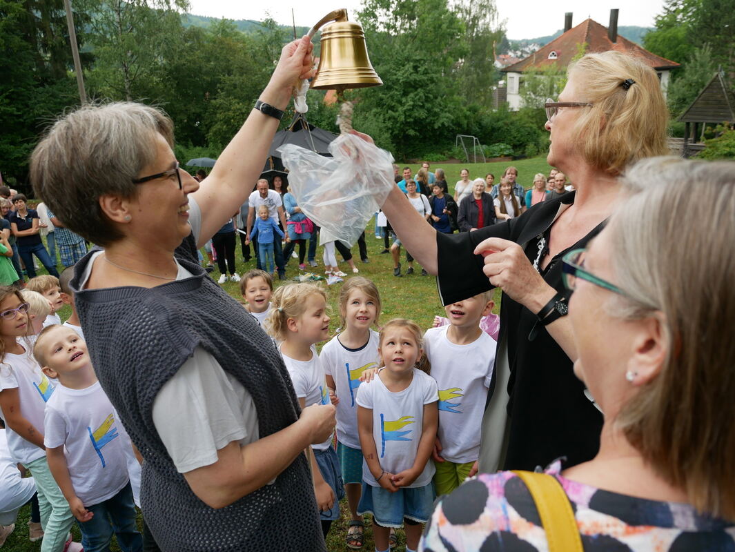 Zum 25-jährigen Bestehen des Kindergartens in der Gönninger Stöffelburgstraße schenkte Ulrike Hotz (rechts) der Kindergarten-Leiterin Martina Klöden (links) eine Glocke – sehr zur Freude der Kinder.