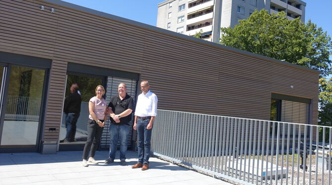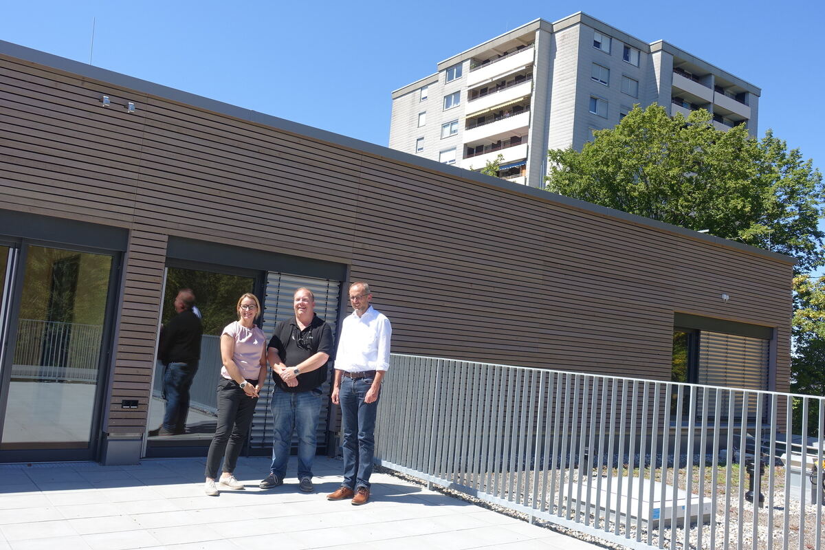 Katja Büchel, Jochen Schmid (Mitte) und Frank Bechle auf der Terrasse des Kinderhauses. Dessen Fassade ist aus Weißtanne.