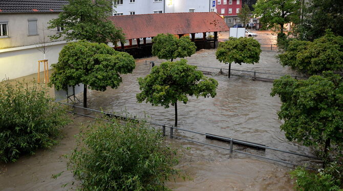 12:35 Uhr Der Ortskern Betzingens wurde stark überflutet. Schuld war die Echaz, deren Wasserpegel laut Herrmann innerhalb von Minuten um 1,50 bis zu 1,80 Meter gestiegen ist. Dabei wurde auch das Klärwerk in der Bezirksgemeinde in Mitleidenschaft gezogen. Wie Torsten Müller, Fachgebietsleiter Gewässer und Hochwasserschutz, bei der Reutlinger Stadtentwässerung berichtet, sei Wasser eingeteten, weshalb es zu Schäden an der Elektrik kam. »Aktuell können wir das Abwasser der Stadt nicht ordentlich klären«, sagt Müller. Man müsse derzeit teilweise verschmutztes Wasser in die Echaz ablassen. Hinzu kam, dass das die Anlage mit Wassermassen überfordert war. »Auf dem Starkregenindex haben wir die Stufe 8 von 12 erreicht«, sagt Müller und ergänzt: »Das kann über eine Kanalbewirtschaftung nicht mehr abgearbeitet werden.«