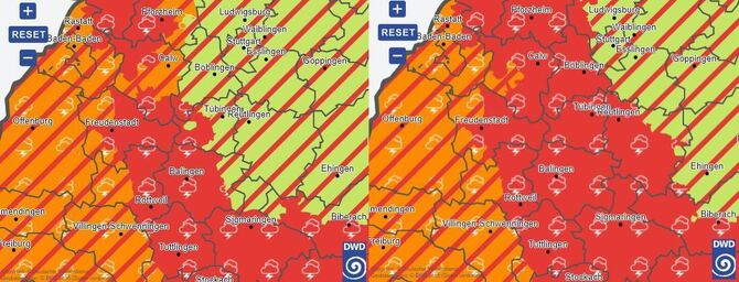 14:31 Uhr Das sieht nicht gut aus. Tiefrot zeigt die Karte des Deutschen Wetterdienstes eine Schlechtwetterfront, die über die Region zieht. Der Screenshot zeigt links den Zustand um 14.28, und rechts 14.31. Rot bedeutet eine Unwetterwarnung der Stufe 3. Damit wird vor orkanartigen Böen mit Geschwindigkeiten zwischen 90 km/h (25m/s, 48kn, Bft 10) und 110 km/h (31m/s, 60kn, Bft 11) sowie heftigen Starkregen mit Niederschlagsmengen zwischen 30 l/m² und 40 l/m² pro Stunde und Hagel mit Korngrößen um 2 Zentimetern gewarnt. Es seien unter anderem verbreitet schwere Schäden an Gebäuden möglich. Bäume können entwurzelt werden und Dachziegel, Äste oder Gegenstände herabstürzen. Überflutungen von Kellern und Straßen sowie örtliche Überschwemmungen an Bächen und kleinen Flüssen sind möglich. (GEA)