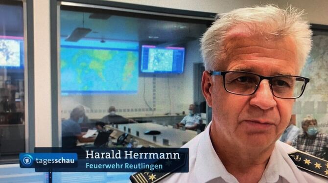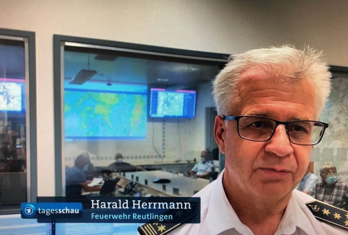 20:20 Uhr Über das Unwetter im Landkreis Reutlingen vom Montagabend wurde heute in den 20-Uhr-Nachrichten der Tagesschau in der ARD berichtet. Gezeigt wurde eine Wohnung, in der Bewohner eingeschlossen waren. Reutlingens Feuerwehr-Kommandant Harald Herrmann kam zu Wort: »Wir hatten Menschen in Lebensbedrohlichen Situationen. Wir haben sieben Personen aus Untergeschosswohnungen mit unseren Tauchern, aber auch fünf Personen aus der Unterführung in Dusslingen mit den Tauchern retten können«, sagte Herrmann vor der ARD-Kamera.