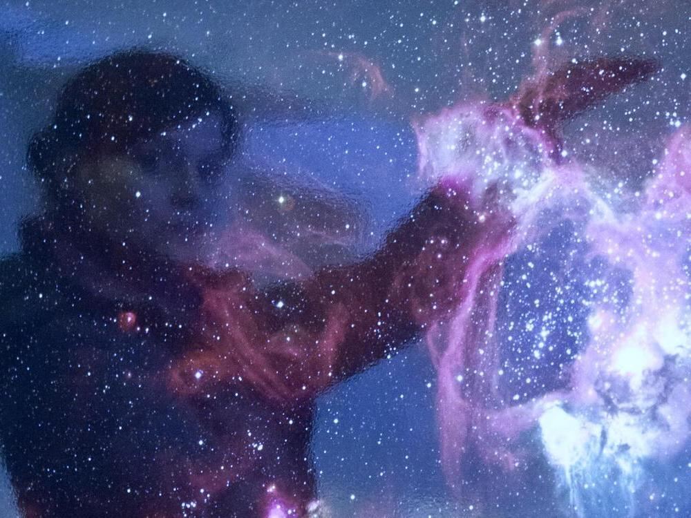 Die Schauspielerin Jördis Johannson hinter einer Sternennebel-Projektion. FOTO: KAREN SCHULTZE
