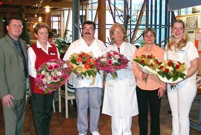 Mitarbeiterehrung im Altenheim Voller Brunnen: (von links) Hausleiter Thomas Lesniak mit Gerlinde Bohnert, Küchenchef Viktor Märklin, Köchin Henriette Rudlof, Brigitte Hoffmann und Melanie Geiselhart.