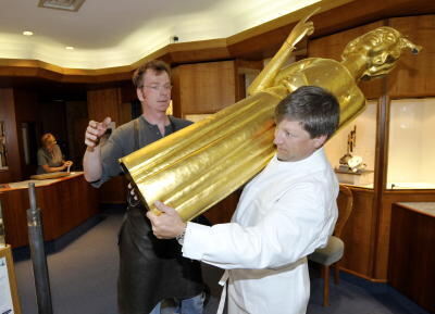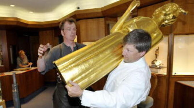 Goldschmied Stefan Lachenmann hat ein Händchen für goldige Engel. Er restaurierte den großen Reutlinger Himmelsboten und verkauft Miniaturen für einen guten Zweck.