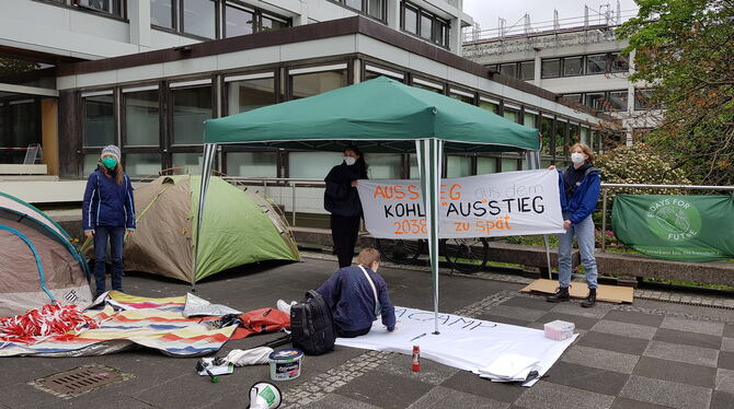Ihre Hauptforderungen – die klimaneutrale Stadt Reutlingen bis 2030, Fotovoltaikpflicht bei Neubauten und ein jährlicher Bericht über die Maßnahmen der Stadt in Sachen Klimaschutz – sollen in Kundgebungen, öffentlichen Diskussionen und ausgelegten Petitionen vertreten werden. Die rund 30 Mitglieder des Orgateams wechseln sich beim Campieren vor dem Rathaus ab. (ele)