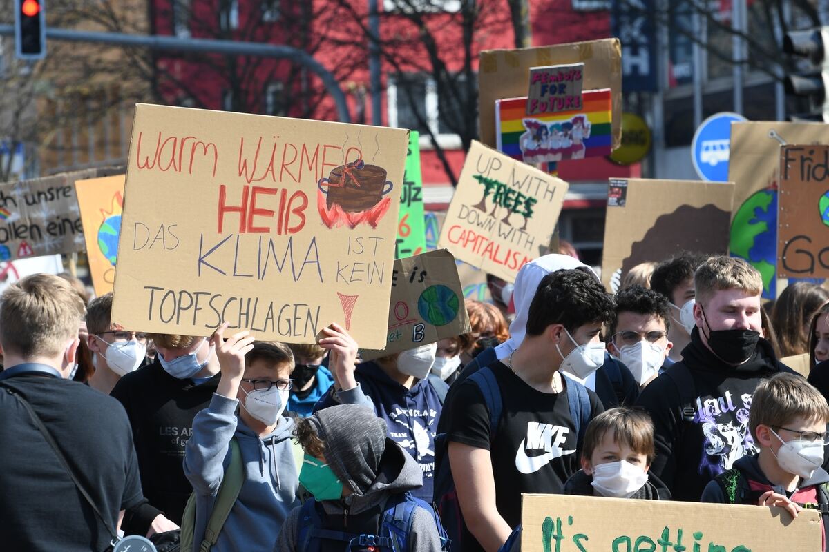 Tatsächlich kann von aufhören keine Rede sein, besser vom Hinhören. Die Sprüche der Demonstranten wie »wir sind hier, wir sind laut, weil ihr uns die Zukunft klaut«, werden in Kriegszeiten ergänzt durch »hoch die internationale Solidarität«. Es sind auch Menschen mit unterwegs, die persönlich von dem betroffen sind, was da in Europa passiert. Marina Perst, 34 Jahre alte Kulturwissenschaftlerin, läuft in schwarzen Klamotten und einem schwarzen aufs Gesicht geschminkten Trauerbalken mit. Ihr Transparent trägt die Aufschrift »Putin zerstört die (Um)Welt «– und zeigt den Russen als Hitler-Fratze. Ihre Schwester lebt und leidet in Putins-Reich, erzählt sie.
