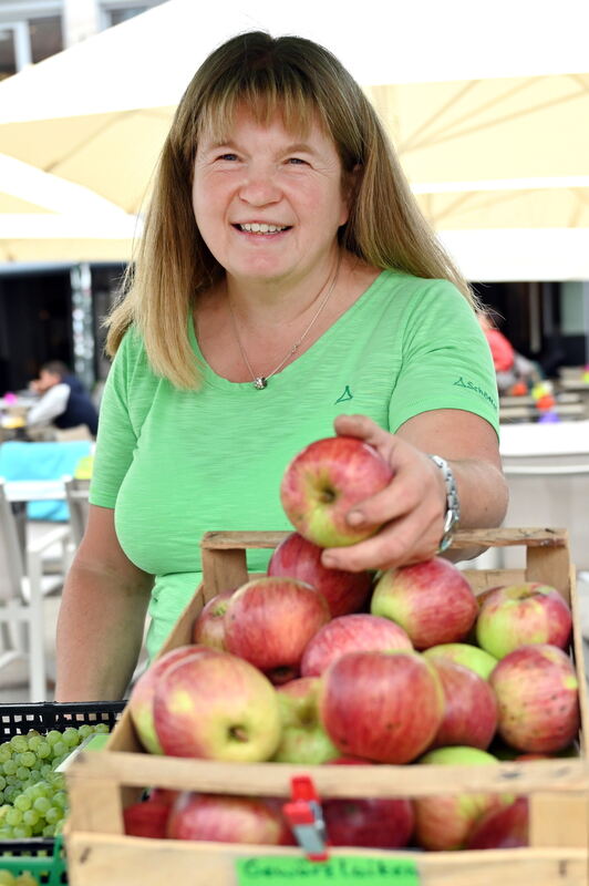 Die Kappishäuserner Wochenmarktbeschickerin Ruth Leins hat auch alte Apfelsorten in ihrem Selbsterzeuger-Sortiment. Darunter urschwäbische Gewürzluiken.