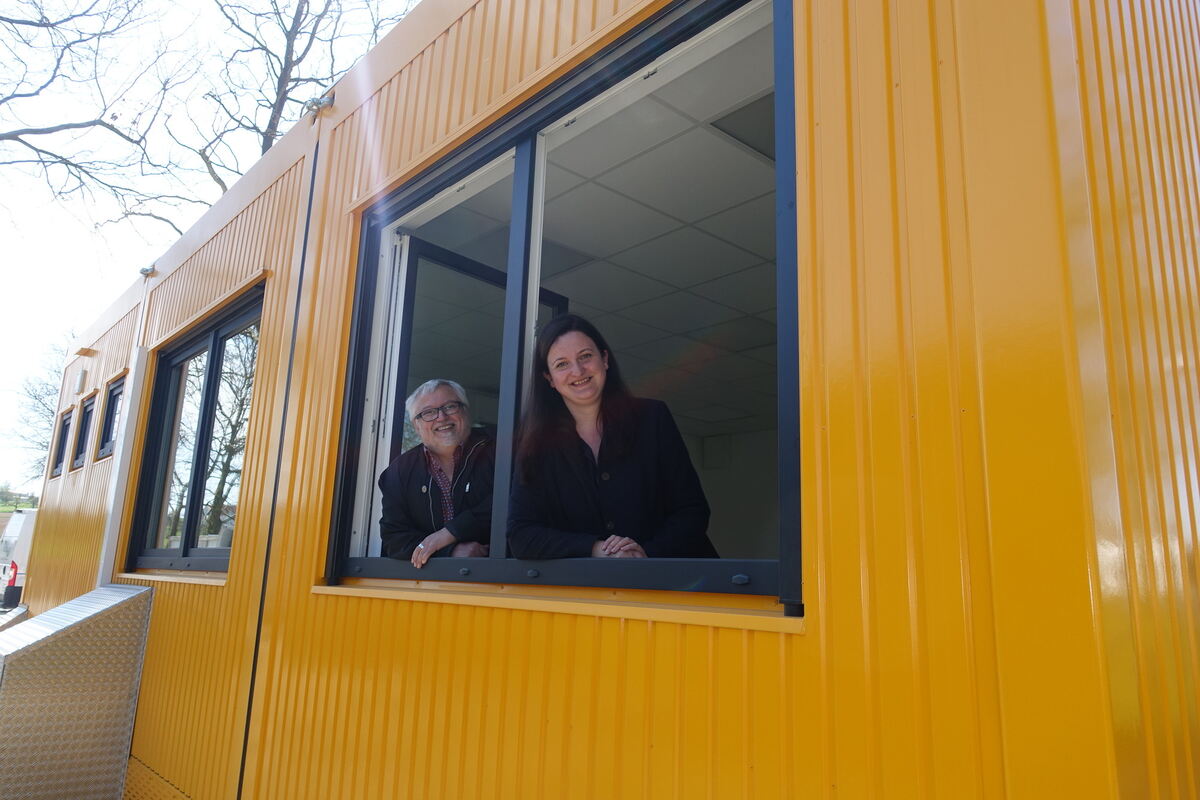 Kathrin Berger und Dieter Pross in einem der beiden Räume des Interimscontainers. FOTO: DÖRR